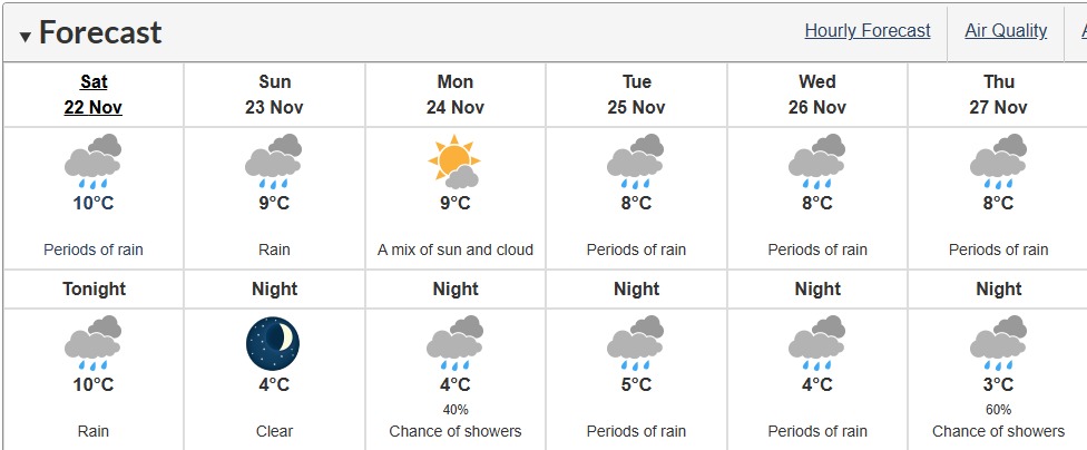 11 月通常是温哥华一年中最潮湿的月份。机场的降雪量仍为 0 厘米,而 1991–2020 年的平均值为 3.2 厘米。