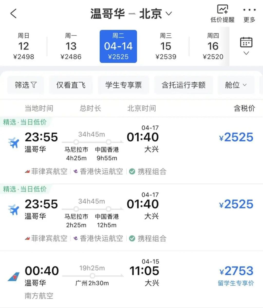 春假的机票价格也比较合适,参考本拿比教育局发布的春假时间(4 月 16 日至 4 月 27 日),如果搭乘周六(4 月 14 日)的飞机回国,价格在 2500-2700 左右: