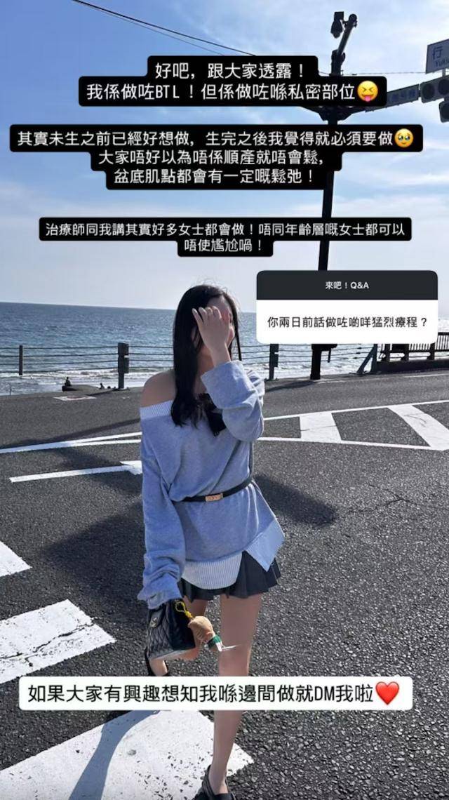 对此陈诗欣表示:其实未生之前已经好想做,生完之后我觉得就必须要做,大家不要以为不是顺产就不会松,盆底肌怎么样都会有一定的松弛,治疗师和我讲很多女士都有做,不同年龄层的女士都可以,不用尴尬的。