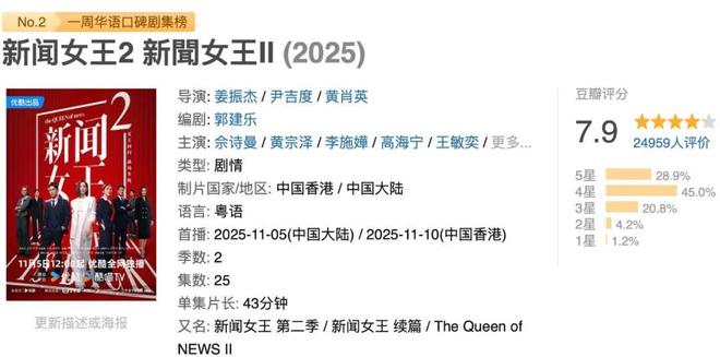 作为2023年现象级剧集的续集,《新闻女王2》在筹备阶段就已备受期待。11月5日,该剧在优酷开播,上线6小时站内热度即突破8000,之后全网讨论热度持续走高。《新闻女王2》豆瓣开分7.9分,不仅从口碑上延续了第一季,由于剧情展现了与现实高度契合的新闻事件,让它成为超越普通职场剧的存在,具有更高的含金量。