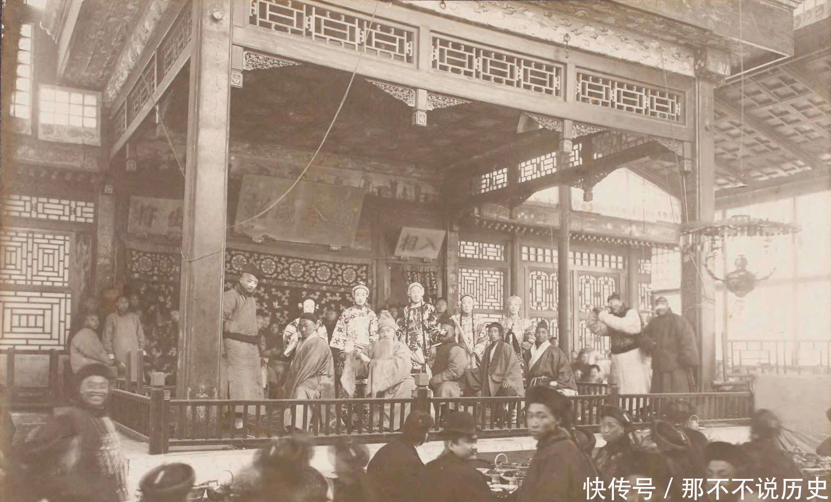 接下来的照片展示的是一场戏曲表演。当时,娱乐活动相对单一,看戏是人们主要的娱乐方式之一。照片中的戏台上,演员正在表演,台上挂着两个匾额,上面写着出将入相,这是传统戏台的标志之一。