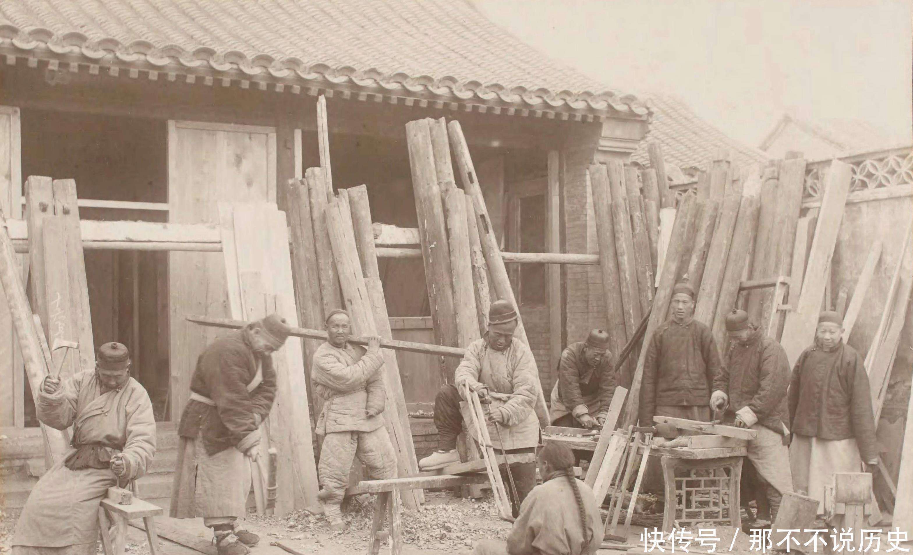接下来是一张木工作坊的照片。过去,盖房子离不开木匠,这张照片展示的是几位木匠正在制作门窗的场景。如今,这样的场景已经很少见了。