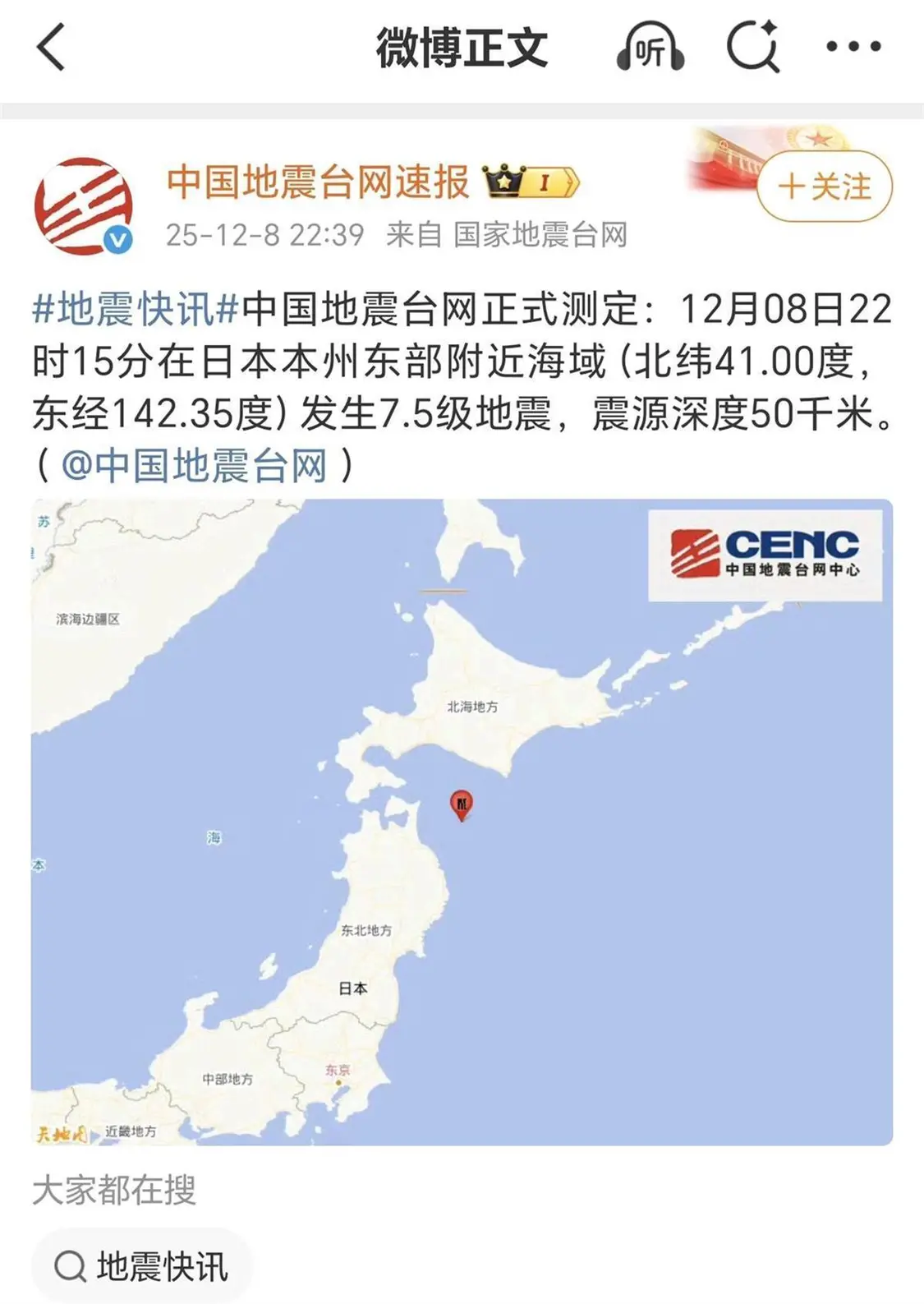 中国地震台网正式测定,北京时间12月8日22时15分在日本(专题)本州东部附近海域(北纬41.00度,东经142.35度)发生7.5级地震,震源深度50千米。