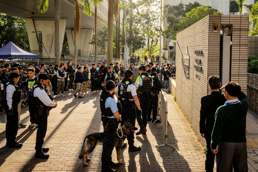 周一,等待对黎智英的判决结果期间,法院外的警察。 LEUNG MAN HEI/AGENCE FRANCE-PRESSE — GETTY IMAGES