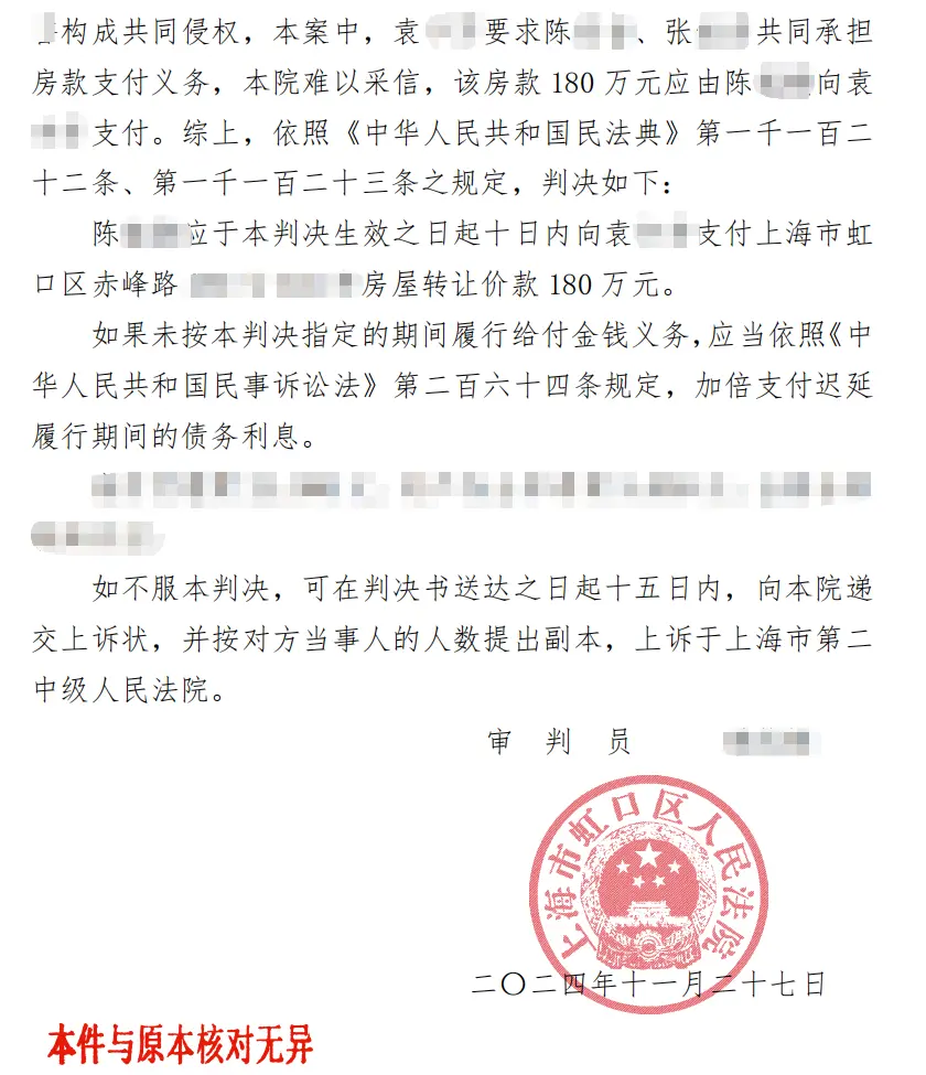 袁某诉称,2023年4月24日,张某委托中介公司出售赤峰路房屋,老陈不在售房群中。2023年6月28日,老陈签下以360万元售房的合同。同年7月22日,售房最后一笔房款支付完毕后,袁某要求张某支付一半房款180万元,张某拒绝支付。经调查后发现,赤峰路房屋的所有房屋转让款打入老陈账户后均被取现转移,其中一笔取现金额为340万元,如此大额取现非老陈一人可为,张某、陈某实际均参与其中,并共同将本案老袁的遗产全部现金转移、隐匿、侵吞,已严重侵害了袁某的合法财产权益。袁某主张上述3人返还这180万元。