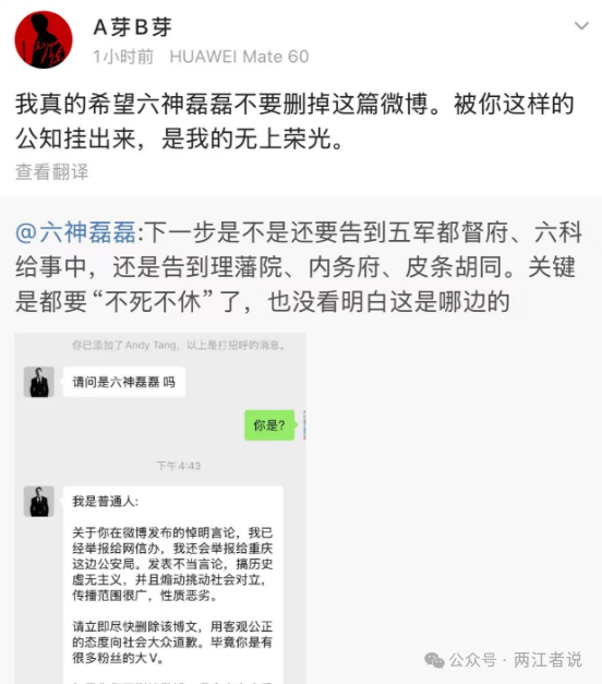 这张图中,用户“Andy Tang”直接发出威胁。他的智商直接把文章定性为“历史虚无主义”、“煽动对立”,并宣告已向网信、公安部门举报。其言论充满最后通牒式的恐吓:“亲自去重庆报案”、“向每个合作客户宣扬”、“不死不休”。这不再是观点争论,这不就是活脱脱地“医闹”剧本:球事不懂,随地撒泼,抓住只言片语,无视整体语境,以上纲上线的指控和骚扰威胁为武器,意图迫使对方就范、噤声。