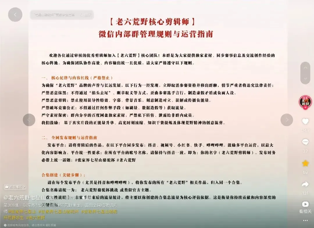 拿這次的柒星山荒野求生挑戰賽來說,第壹季還是3個剪輯師連軸轉,第贰季節目組靈機壹動,由主辦方提供素材,全網授權切片,壹波就招到了接近200人參與剪輯分發。