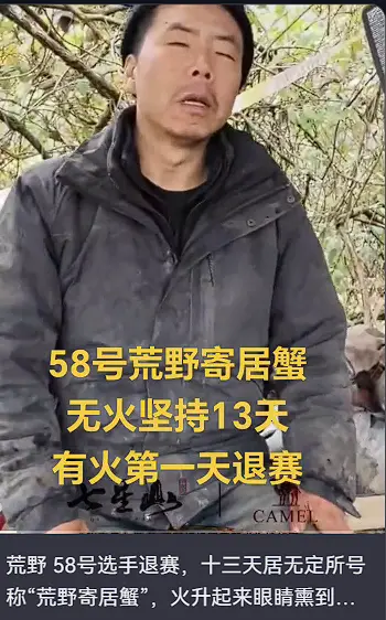 來自貴州的選手荒野寄居蟹在沒有火的日子裡堅持了13天,卻在點著火的第壹個夜晚把眼睛熏壞了。