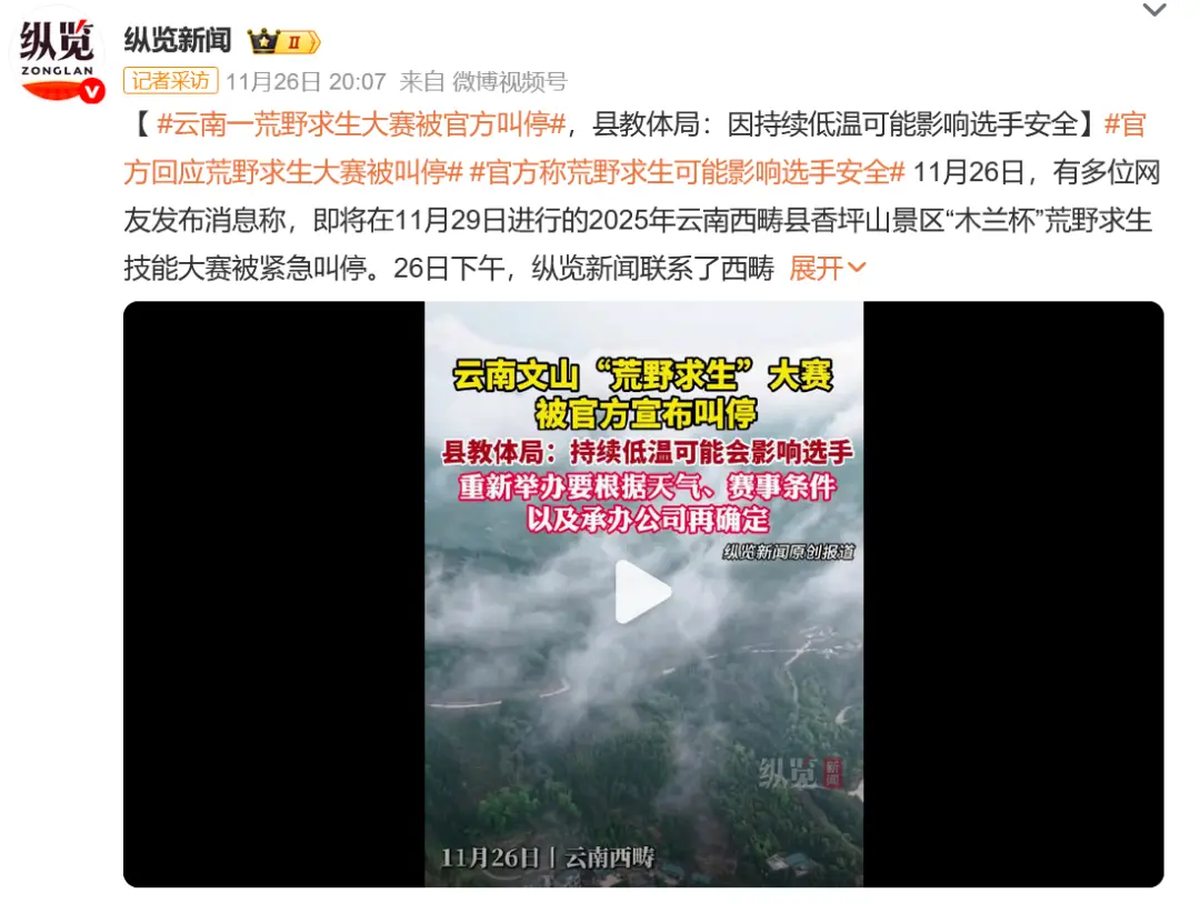雲南文山的“木蘭杯”荒野求生大賽,因為當地氣溫突降,主辦方才意識到“低溫不利於野外生存”,緊急叫停。