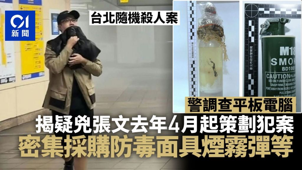 台北19日发生随机杀人案件,造成包括疑凶张文在内4人死亡,另有11人受伤。警方调查指张文的平板电脑发现,他早于去年已策划攻击,同年4月起于网上密集采购战术手套、防毒面具、防护盾牌、烟雾弹等,其中仅24枚烟雾弹便花费4.8万元新台币(约1.2万港元)。