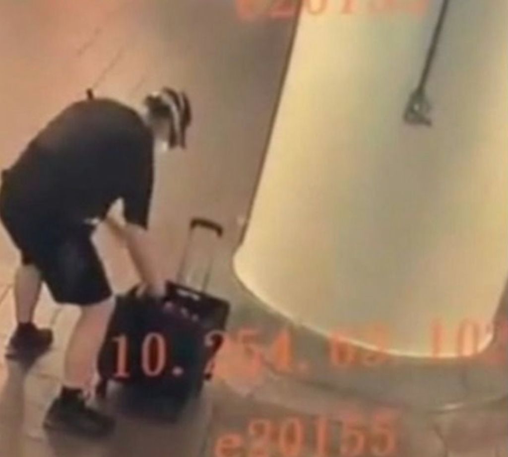 张文在台北车站丢烟雾弹时,身旁拖着装满汽油弹的行李箱。(影片截图)