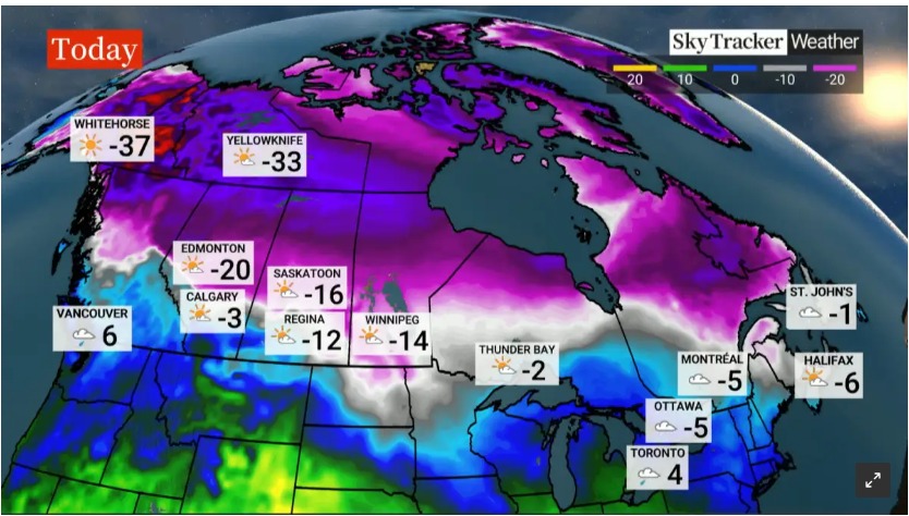 12月以来,加拿大西北部持续极端寒冷的,气温在 -20°C 至 -40°C 之间已维持数周。12月23日,育空地区记录了自1975年以来12月的最低气温。加拿大西部遭遇严寒天气,当地电网面临“巨大”压力,