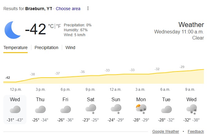 预计直到一月才会出现明显回暖,本周剩余时间育空的夜间最低气温可能仍在 -40°C 至 -50°C 之间。
