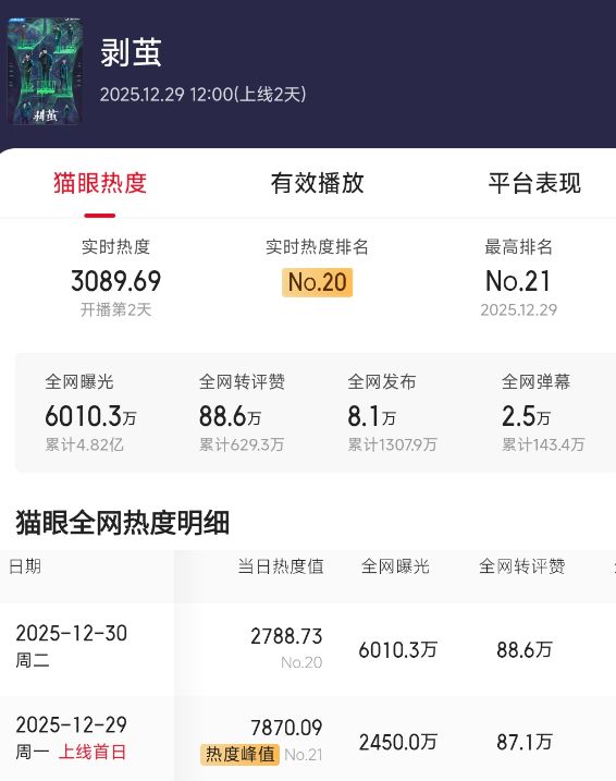 然而就在跨年這個檔期,國產劇市場率先抬上來另壹部新劇,它就是《剝繭》,劇情和陣容都不容小覷,開播後站內熱度輕松突破7000,看來真正的年末黑馬出現了!