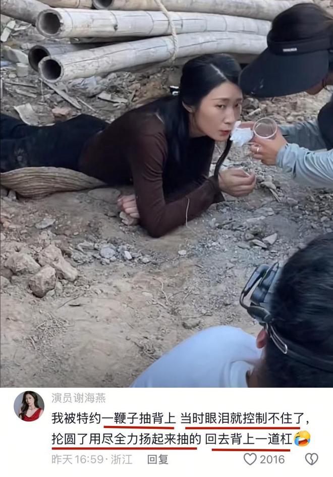 短劇女演員謝海燕說,自己被特約演員壹鞭子抽背上,當時眼淚就控制不住了,“掄圓了用盡全力揚起來抽的,回去背上壹道杠。”