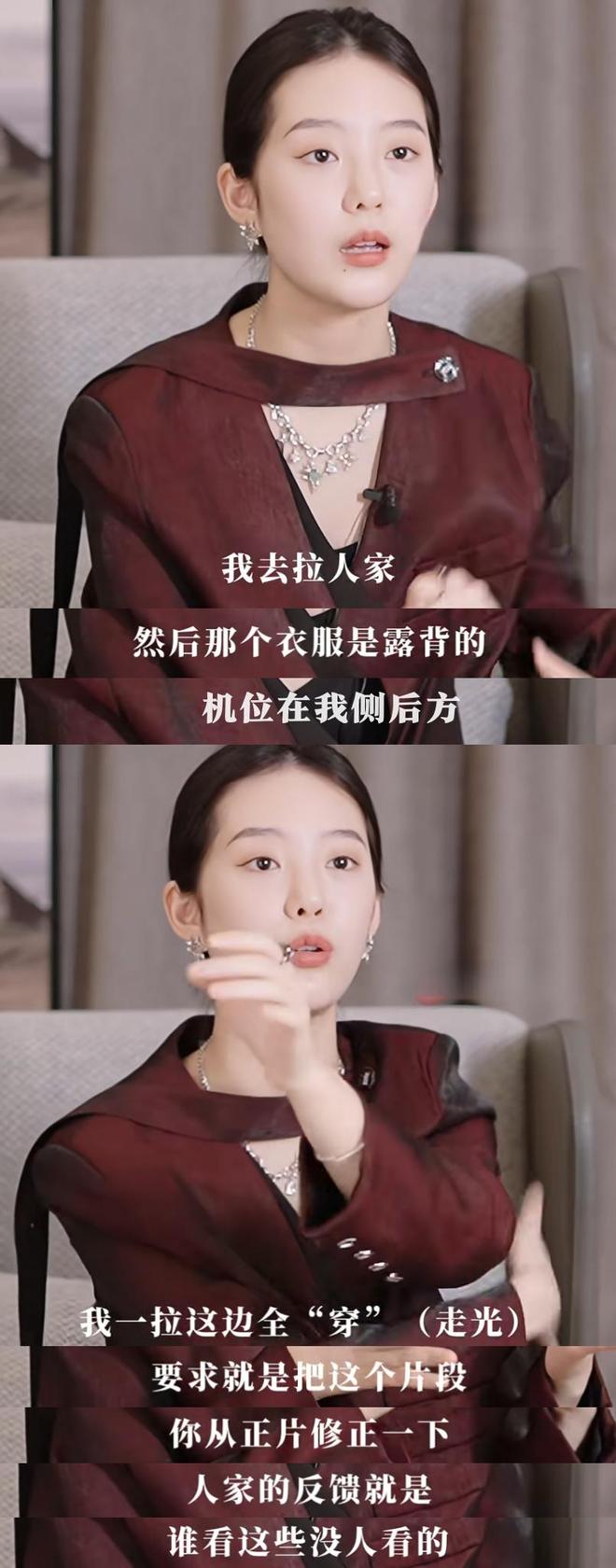 劇組不但沒人提醒她,還把走光畫面剪進了正片,當她要求刪除時,得到的回復卻是:誰看這些,沒人看到的。