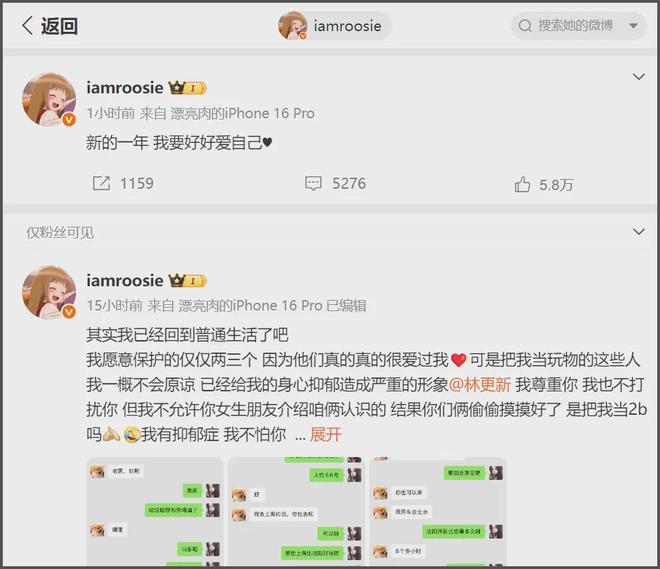 网红司晓迪开年瓜的后续来了!司晓迪上线删除了大部分爆料,只把林更新相关博文转为粉丝可见,还发文表示新的一年要好好生活,但转头就被网友扒出跑到外网持续爆料,还称要放大尺度照,更多细节也被曝光。