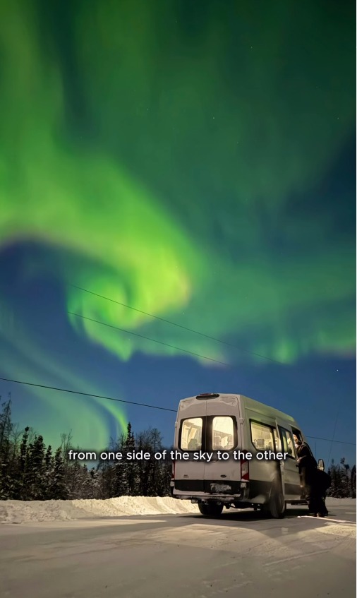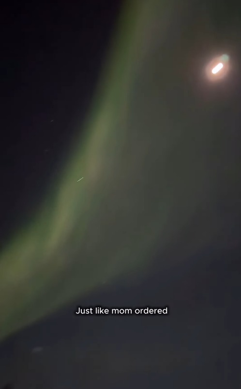 加纳激动地回忆:“你猜怎么着?就像妈妈点的一样,北极光就在我们头顶,肉眼就能看到,从绿色到黄色再到紫色,从天空一端跳舞到另一端,美得不可思议”。