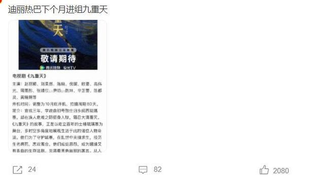 当大家都以为,现在的阵容非常豪华的时候,一件意想不到的事情发生了,网上突然传出,迪丽热巴也将出演《九重天》,她将饰演单元女主。