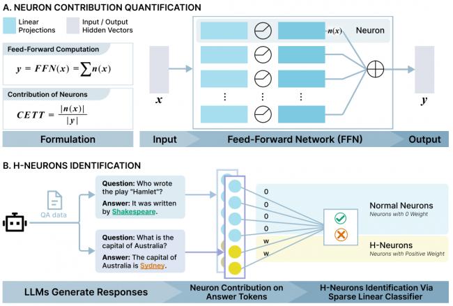 此前,人们大多从整体上研究这个问题,比如检查训练数据是否有偏差,或者让 AI 自己输出置信度。但是,这就像只知道一个人发烧,却不知道哪个器官感染了一样。本次清华团队的创新之处在于,他们决定拿起显微镜直接去观察 AI 大脑内部里的数千万甚至数亿个神经元,看看当 AI 在撒谎的时候,到底是哪些神经元在活跃。