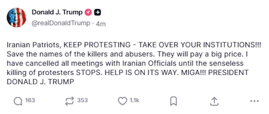 特朗普在Truth Social称:「伊朗的爱国者们,继续抗议,接管你们的机构吧!!!记住那些凶手和施暴者的名字。他们将付出沉重的代价。」