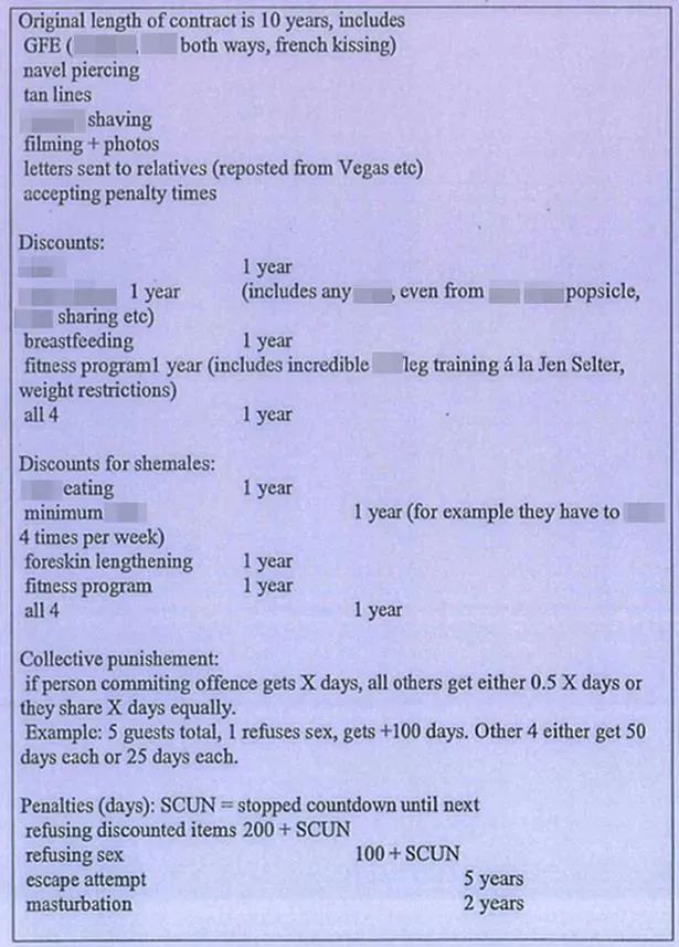 合同中还有一个令人细思极恐的条款。内容是均摊惩罚的规则。说比如一共有 5 个服伺者,只要有其中一个拒绝发生性关系,那么拒绝的这个人要增加 100 天,其他 4 个人每人增加 50 天。
