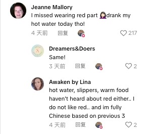 在Lorna视频的评论区,美国网友@Awaken by Lina留言说:“喝热水、穿拖鞋、吃热食……我倒还没听过要穿红戴红……按这三条,我完完全全就是个中国人啊”