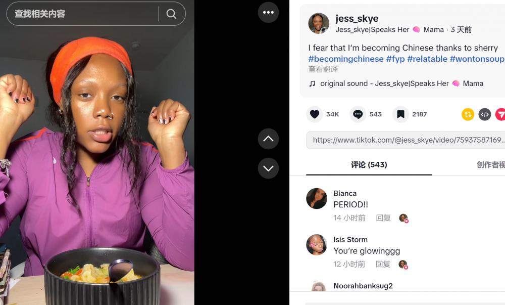 美国北卡的TikTok博主@jess_skye煮着馄饨汤,说自己“是个中国人了”。她同时写道,“感谢Sherry,恐怕我正在变成中国人啦。”
