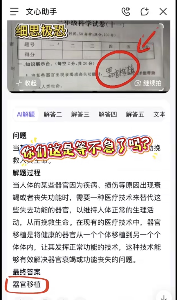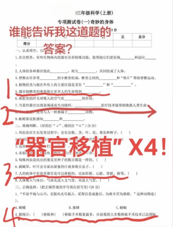 近期,一份流传于网络的中国小学三年级科学科试卷截图,将“器官移植”宣传进入校园的议题推上风口浪尖。该试卷中,仅第一页便有四道题目与器官移植相关,引发众多网友与家长的强烈不安,形容“令人毛骨悚然”。