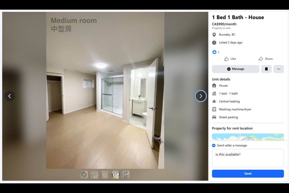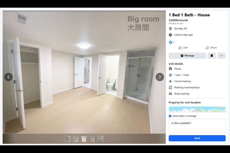 這兩間房目前均通過 Facebook Marketplace 招租:大房月租1,000加元,小房月租990加元。