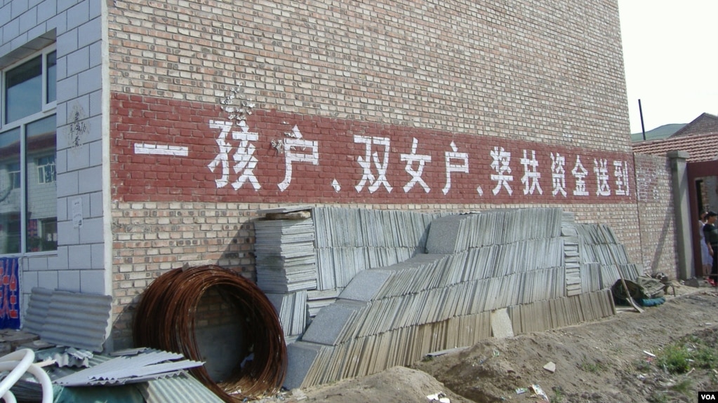 资料照片:中国政府几十年来一直执行所谓的“独生子女政策”,但在2016年和2021年分别允许生育第二胎和第三胎。其实在中国宣布允许生育二胎政策之前,一胎化政策已在逐渐松动。图为河北某农村认可可以生育两个女孩的计生宣传口号。(2007年7月)