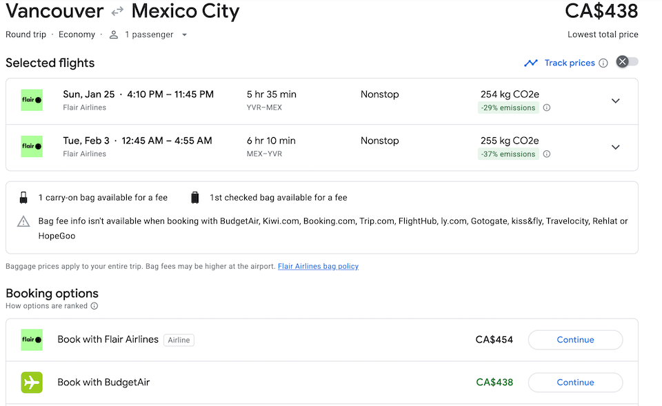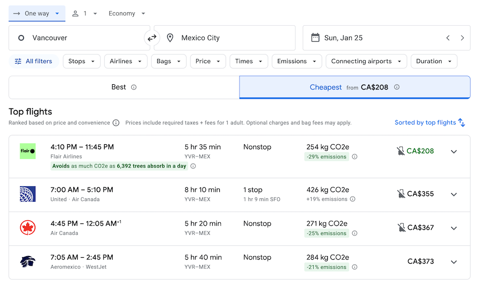 1 月 25 日星期日,Flair 航空從溫哥華 (YVR) 直飛墨西哥城 (MEX) 的單程航班,票價僅為 208 元。這家廉價航空公司比加航與墨西哥航空的直飛航班價格(分別為 367 元和 373 元)便宜 150 多元。