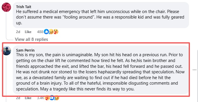 死者的父亲在SnowBrains社交媒体上发布了最新消息,称他的儿子在与双胞胎兄弟和朋友一起登上缆车之前,已经不慎摔倒导致头部受伤。当时这名年轻人表示,在登上缆车之前,他感到非常疲倦。当这名18岁的年轻人、他的双胞胎兄弟和朋友们接近山顶站台,安全杆升起时,他似乎昏了过去,导致他向前倾倒并坠落。
