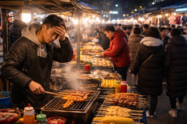 河北摊主东阳称:“投入1万元做烤鹅头,一天卖三四百元,扣掉成本几乎不剩钱。生意越来越难,年年换一批摊贩。”