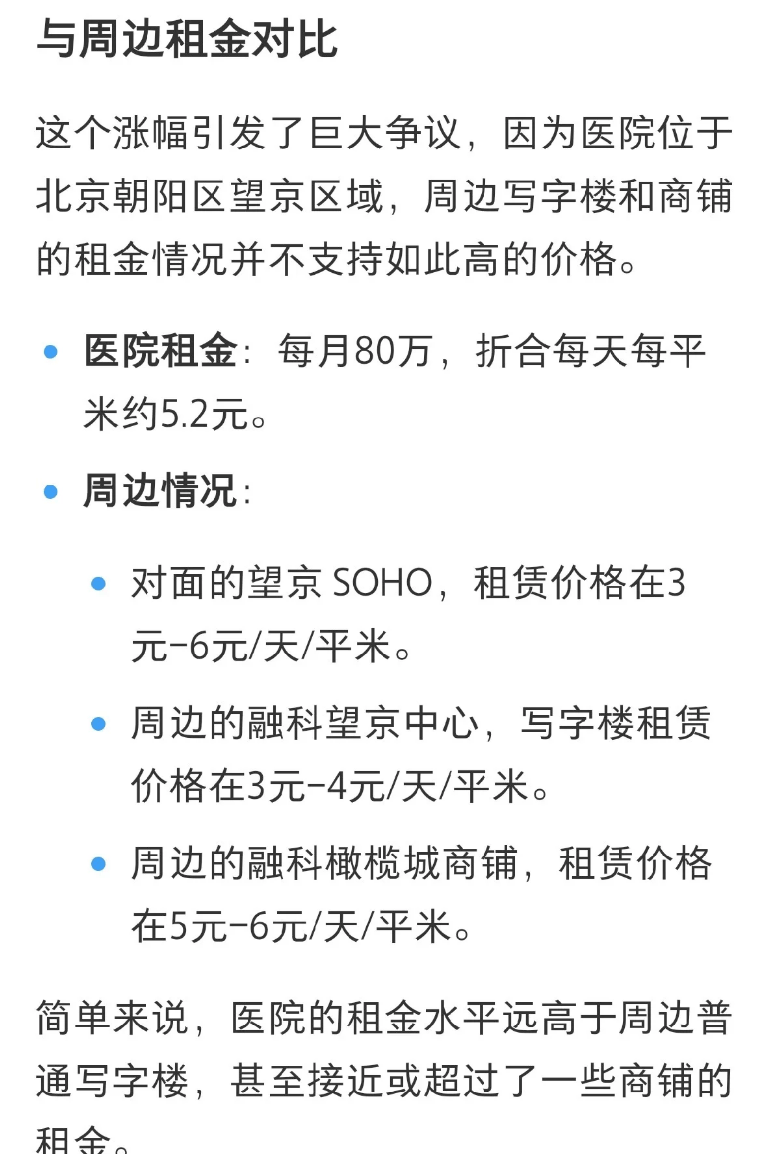 十年前,望京soho为3.3左右,嫣然医院2.6,整栋楼抬了,便宜了一点点,并无半价之举,这两年房子跌价房租降价钱难挣是市场行情,却逆势涨价,现在5.2,用一楼临街商铺的价格租整栋楼!房东开始便宜一点可能是想着医院装修成本大,搬家不易,拿捏别人的,还让别人签无限责任!