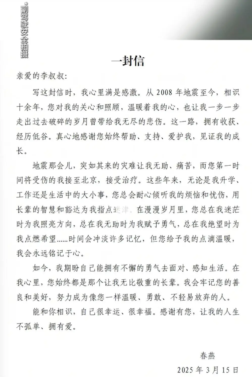 “长久以来李叔叔对我都很关心照顾,我们一直像亲人一样,见面就有非常强烈的熟悉感。”朱春燕说,情绪低谷时,李亚鹏总会耐心开导她,这份陪伴让她在困境中始终能感受到温暖。