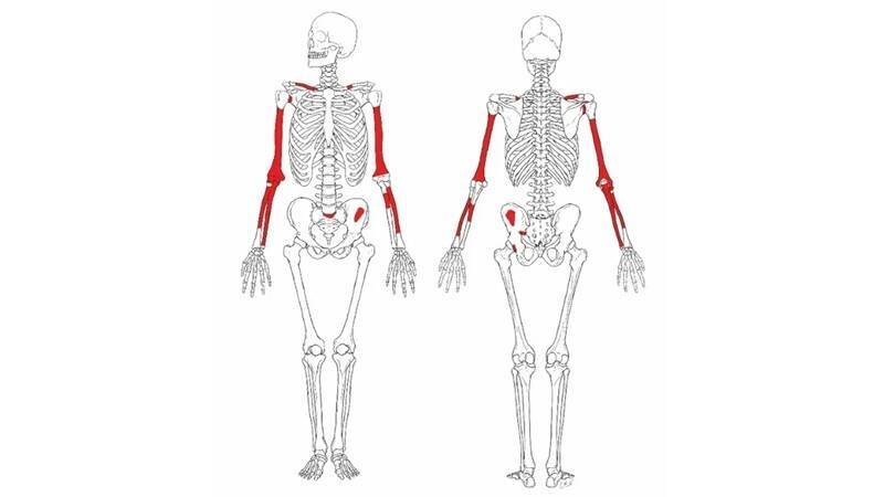图中红色区块即为本次发表的“能人”化石实际出土部位。透过套叠在现代人类骨骼(白色轮廓)上,可清晰看见这具化石保留了极为完整的上肢与锁骨结构;这些骨骼证据成为科学家判断人类祖先仍保有“树栖攀爬能力”的关键铁证。(图撷取自Grine, F. E. et al.,2026)