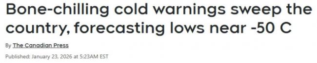 一股极端北极冷空气正横扫加拿大,多地气温跌至危险水平。