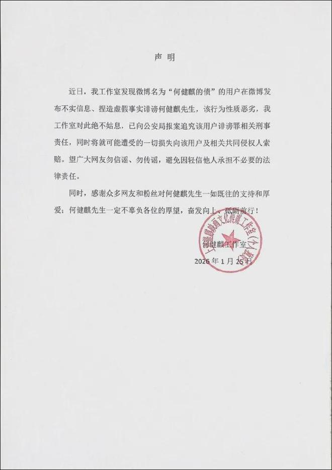 隨後,@何健麒SEVEN-7工作室 發布嚴正聲明,稱已向公安局報案並追究該用戶誹謗罪及相關刑事責任。