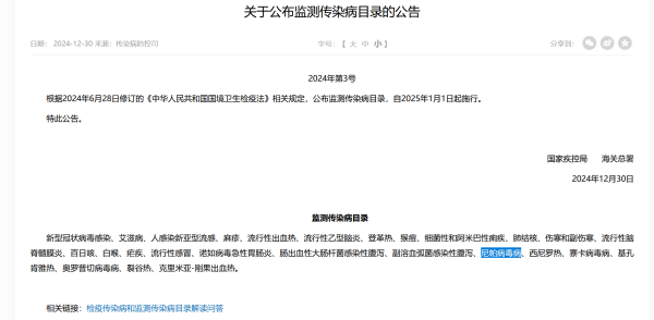 中國國家疾控局、海關總署2024年12月發布的《監測傳染病目錄》中,包含尼帕病毒病等傳染病。