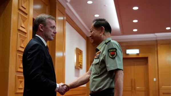 2024年8月29日,中共中央軍委副主席張又俠(右)在北京八壹大廈會見美國國家安全顧問傑克·沙利文前握手。(圖片來源:Getty Images)