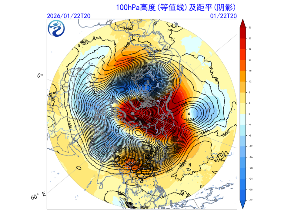 1月22日100hPa位势高度(等值线)及其距平(阴影)分布(单位:dagpm)