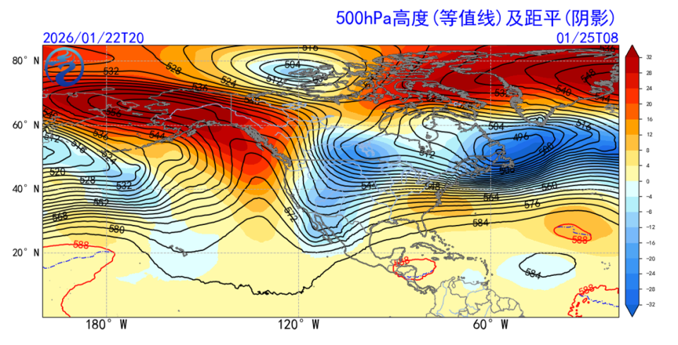 近期极涡呈现为多极型,一个极涡中心一直偏向西半球,有利于极地冷空气扩散南下。1月中旬后期,太平洋北部高压脊强烈发展并稳定维持,脊前偏北气流将极地冷空气引导南下,在加拿大中东部和美国东北部堆积,形成稳定少动的涡旋。