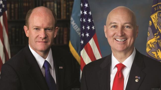 資料照片:參院外交委員會亞太小組資深成員、來自特拉華州的民主黨聯邦參議員昆斯(左)和參院外交委員會亞太小組主席、來自內布拉斯加州共和黨聯邦議員瑞克茲(右)。