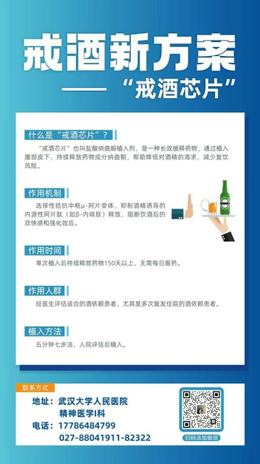 近期,武漢大學人民醫院(湖北省人民醫院)精神衛生中心聯合肝膽外科團隊,成功為壹名重度酒精依賴患者實施「戒酒芯片」(鹽酸納曲酮植入劑)手術。這是該院開展的壹項新技術,旨在幫助長期受酒癮困擾的患者有效防復飲。