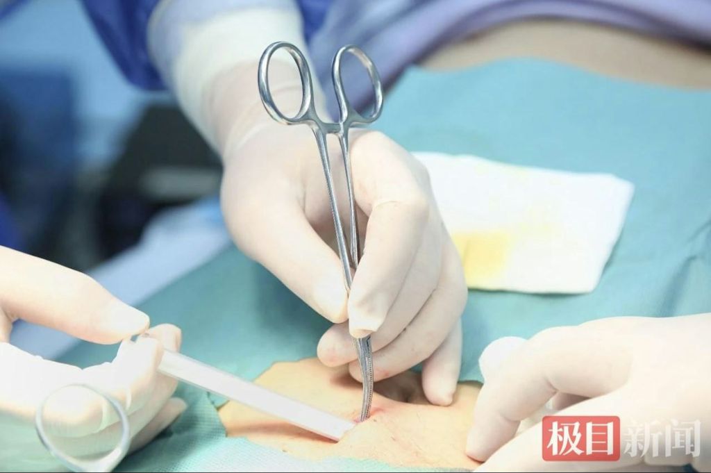 手術當天上午11時15分,在外科門診手術室正式開始。肝膽外科汪斌副主任醫師先為李先生進行局部皮膚麻醉,隨後在肚臍下方兩指處切開約1厘米小口,用止血鉗在皮下脂肪層分離出壹條小隧道,再將納曲酮植入劑順利推入,最後縫合傷口。全程僅10分鍾,李先生幾乎無痛。