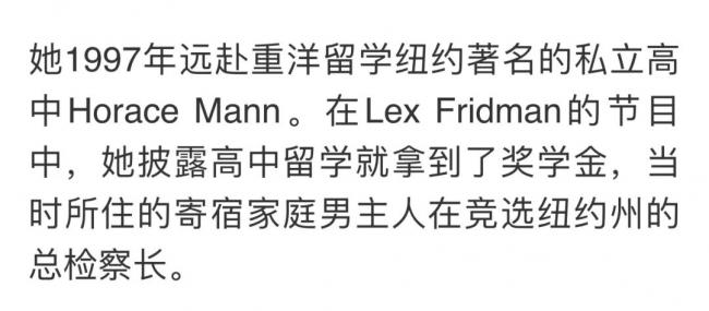 14岁时她说想去美国,随即被送入纽约的顶级私立高中——Horace Mann School,全美排名前五的常春藤预备校,每年有近一半毕业生直通藤校。