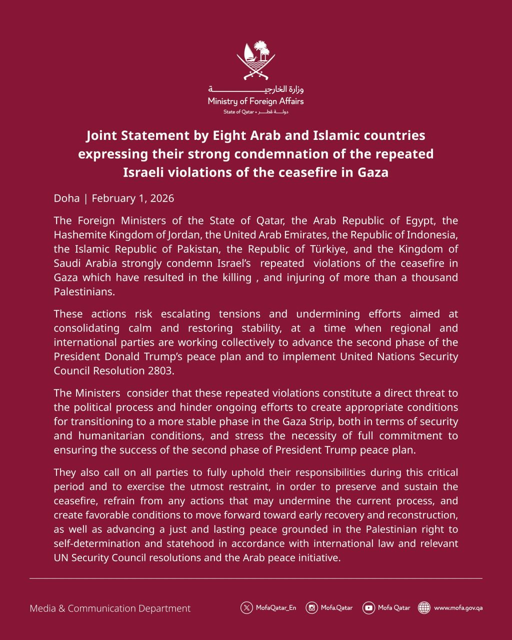 卡塔尔外交部2026年2月1日表示,卡塔尔、埃及、约旦、阿联酋、印尼、巴基斯坦、土耳其和沙特八国外交部长发表联合声明,强烈谴责以色列一再违反加沙停火协议,在近期导致一千多名巴勒斯坦人伤亡。(X@MofaQatar_EN)