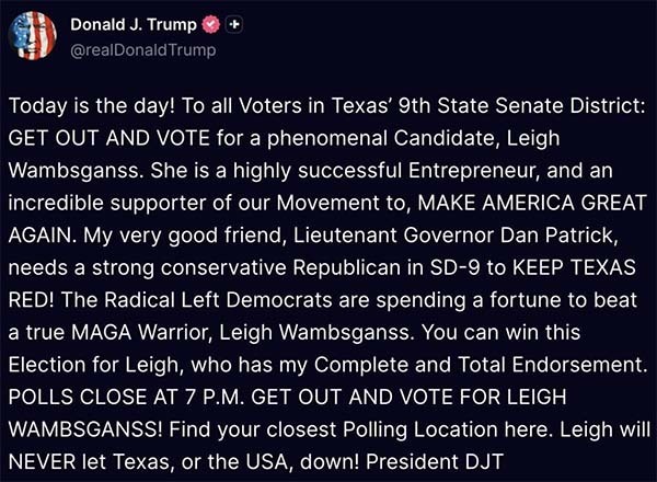 然而,1月31日的选举结果显示,民主党候选人雷赫梅特在得州第9选区参议员特别选举中,以57%对43%的得票率击败万布斯甘斯,将这一共和党把持数十年的选区“翻蓝”。随后,特朗普也“翻脸不认账”,宣称“没听说过这件事”。