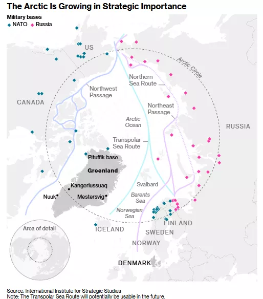 对格陵兰的算盘暴露出对极地地理的基本误解,也误判了中国的战略选项。中国唯一通往北冰洋的路径在世界另一侧,绕过日本(专题),穿越美国的阿留申群岛,然后经白令海峡进入俄罗斯北极地区。